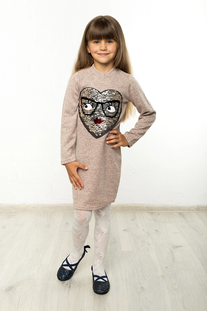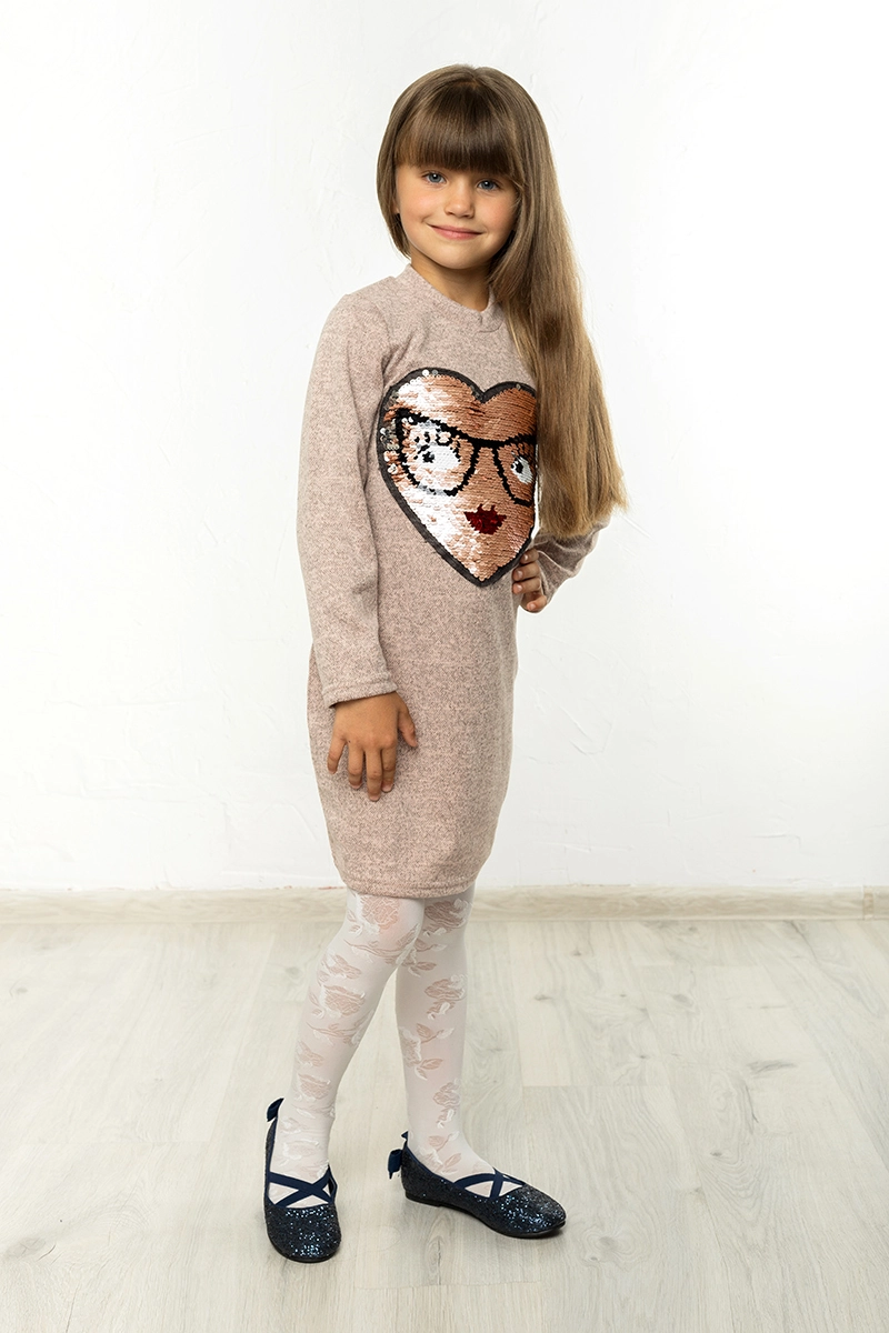 Детское очаровательное платье прямого покроя с длинным рукавом, спереди украшено пайетками перевертышами. Замечательная модель для повседневной носки.