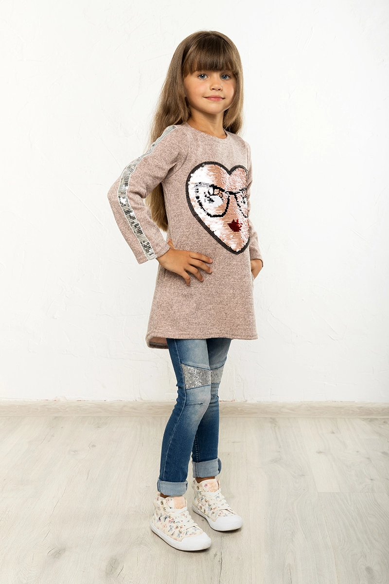 Замечательная детская туника Мари с карманами и асимметричным низом, выполнена из трикотажа ангора софт. Спереди украшена пайетками перевертышами, можно менять цвет картинки, и на рукавах лентой из пайеток. Отличная и практичная модель для маленьких модниц.